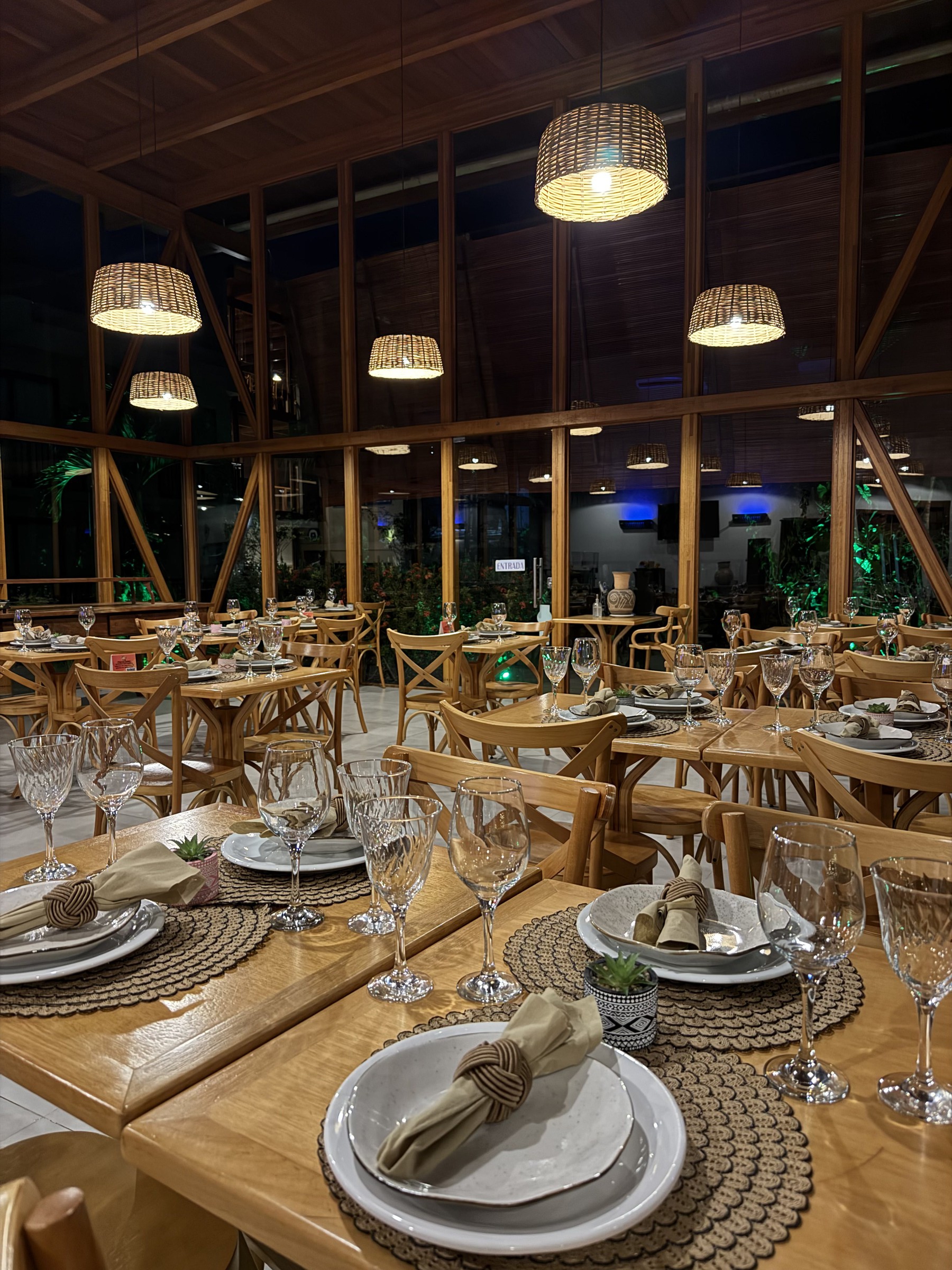 O Restaurante Patuá tem um ambiente moderno, com decoração sofisticada e alegre, integrado à natureza que cerca a pousada. É o lugar perfeito para um almoço tranquilo após a praia ou um jantar romântico sob as estrelas.