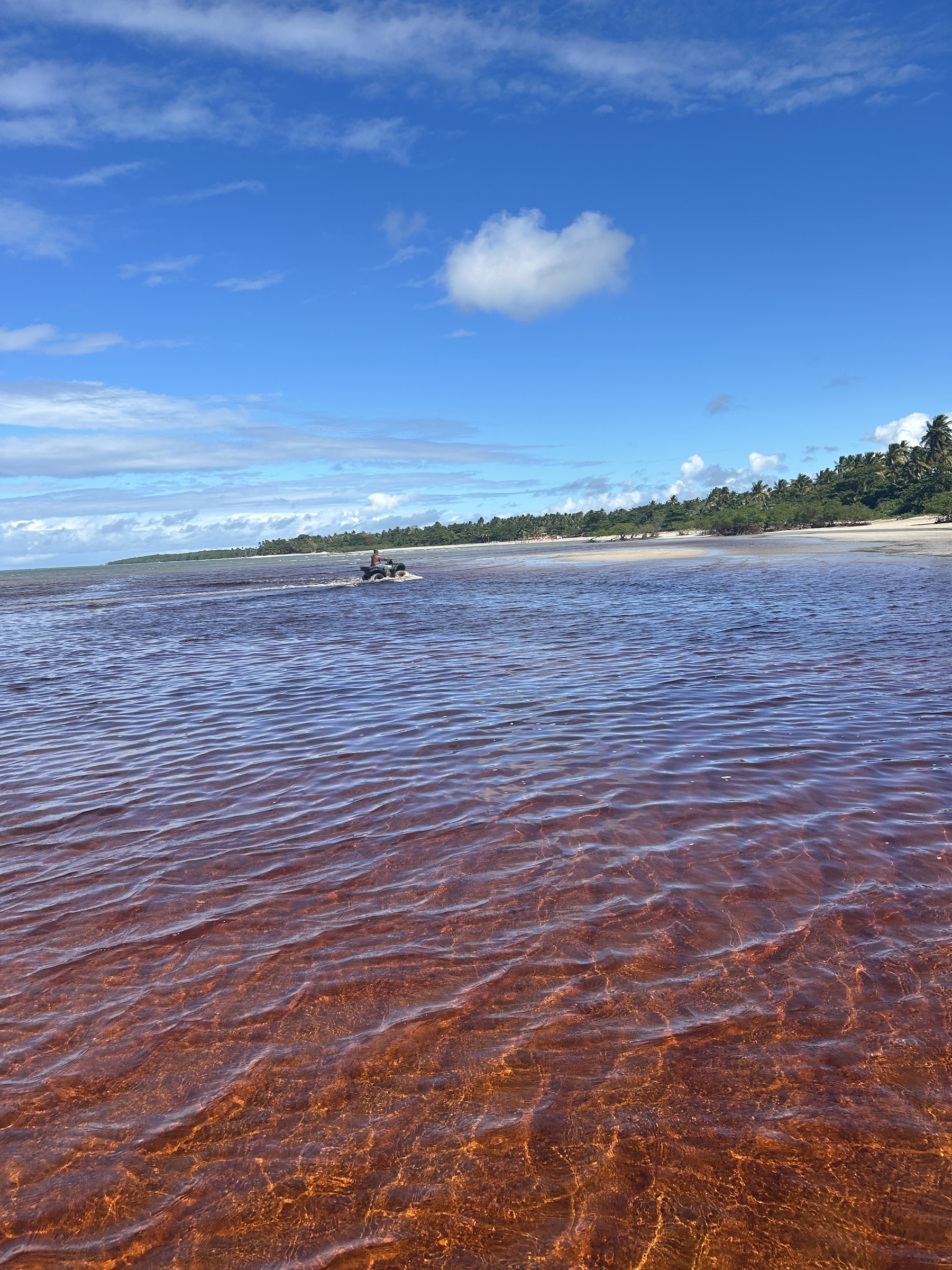 Chegando lá, prepare-se para se apaixonar. É onde o rio cruza com o mar, criando um espetáculo natural incrível: as águas avermelhadas do rio se misturam com o azul do mar, formando um contraste hipnotizante.